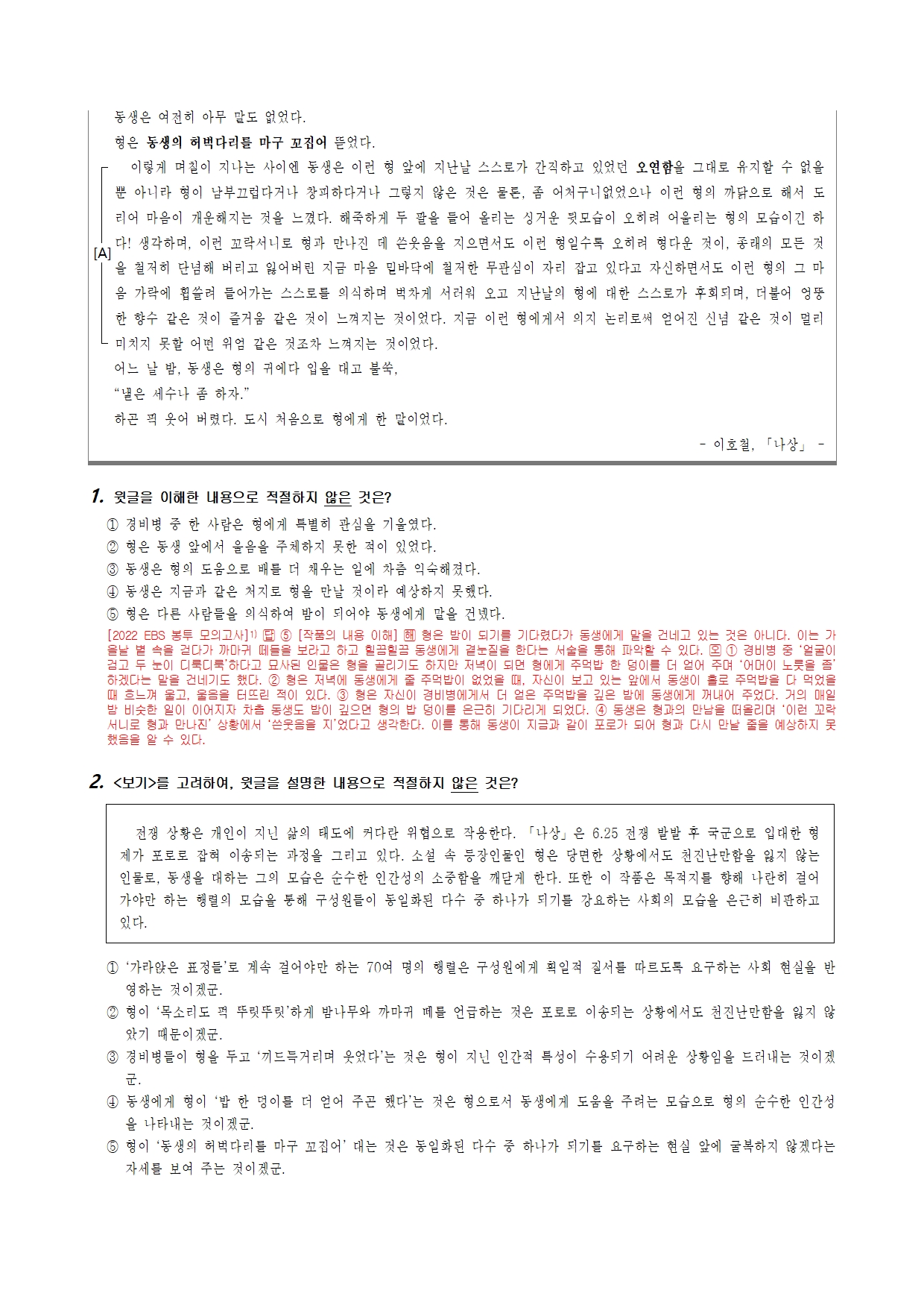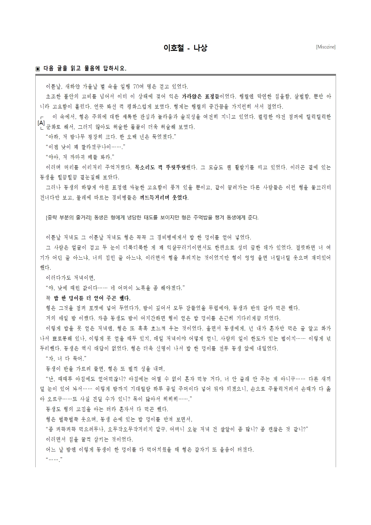 문학 작품 문제/현대 소설 현대소설 - 이호철 - 나상(2022 EBS 봉투 모의고사) by Misozine 2023. 12. 20. 728x90 현대소설 - 이호철 - 나상(2022 EBS 봉투 모의고사).hwp 0.08MB 728x90 공유하기 게시글 관리 Misozine 문학 저작자표시 비영리 변경금지 (새창열림) '문학 작품 문제 > 현대 소설' 카테고리의 다른 글 현대소설 - 김훈 - 남한산성(2022 EBS 봉투 모의고사) (1) 2023.12.08 관련글 현대소설 - 김훈 - 남한산성(2022 EBS 봉투 모의고사)
