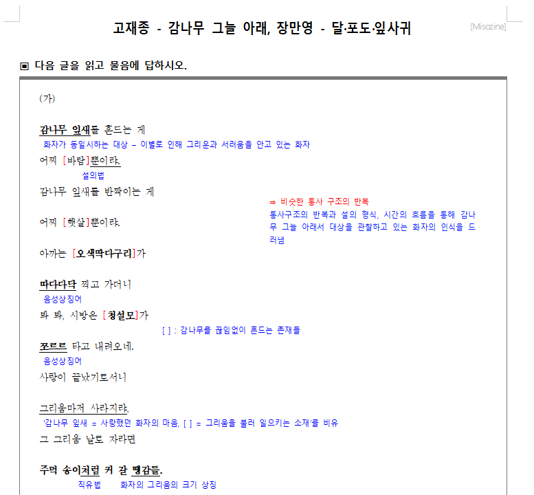 문학 작품 분석/현대시 현대시 - 고재종 - 감나무 그늘 아래, 장만영 - 달·포도·잎사귀(해설 편집중)(2020 4주특강) by Misozine 2024. 6. 24. 728x90 현대시 - 고재종 - 감나무 그늘 아래, 장만영 - 달·포도·잎사귀(해설 편집중)(2020 4주특강).hwp 0.08MB 728x90 공유하기 게시글 관리 Misozine 문학 저작자표시 비영리 변경금지 (새창열림) '문학 작품 분석 > 현대시' 카테고리의 다른 글 현대시 - 김광규 - 달팽이의 사랑, 나희덕 - 양계장집 딸(해설 포함)(2020 시크릿X) (0) 2024.06.24 관련글 현대시 - 김광규 - 달팽이의 사랑, 나희덕 - 양계장집 딸(해설 포함)(2020 시크릿X)